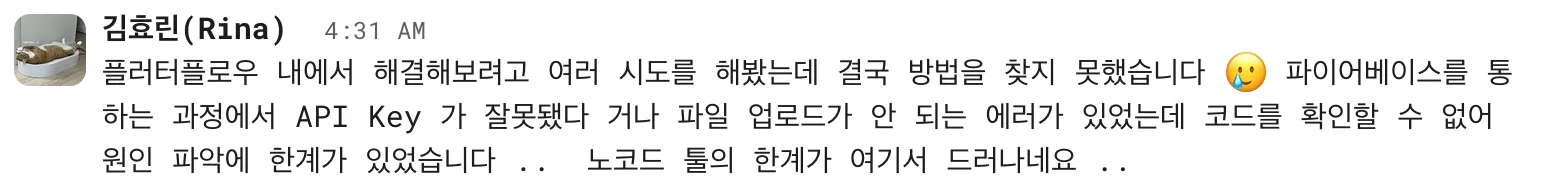 플러터 플로우의 경우, 빌드 과정이 번거롭고 디버깅이 어렵다는 단점이 있었어요. 가설 검증을 위해 하루에도 여러 번 작은 수정들이 발생하는 데 빌드를 해야만 확인할 수 있는 요소들이 많다 보니 시간 소요가 많이 되었습니다. 테스트하다 에러가 뜰 때 네이티브(iOS, Android), 플러터, 플러터플로우 중 어디가 원인인지 파악이 안 되어 비 개발자인 제게는 문제를 해결하는 과정이 많이 어렵기도 했고요.