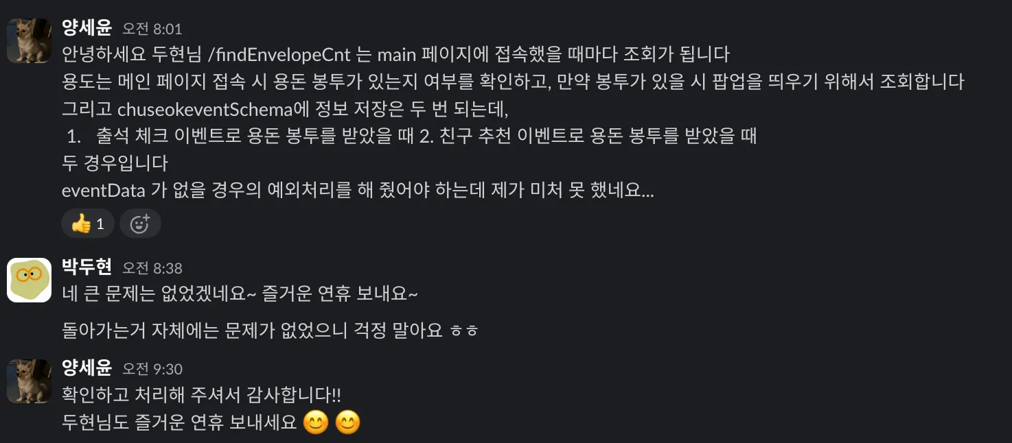 제가 입사하고 거의 1달 반 정도 뒤에 바로 진행했던 첫 업무였어요. 엄청 어려운 업무는 아니었지만 새로운 언어에 적응하고, 프로덕트에 대한 이해도도 높지 않은 상황이었고, 회사에 적응하기도 바빴던 시기인지라 부담이 엄청 컸던 것 같아요. 그래서 이벤트 론칭하고도 주말에 계속 모니터링 하고 있었어요.