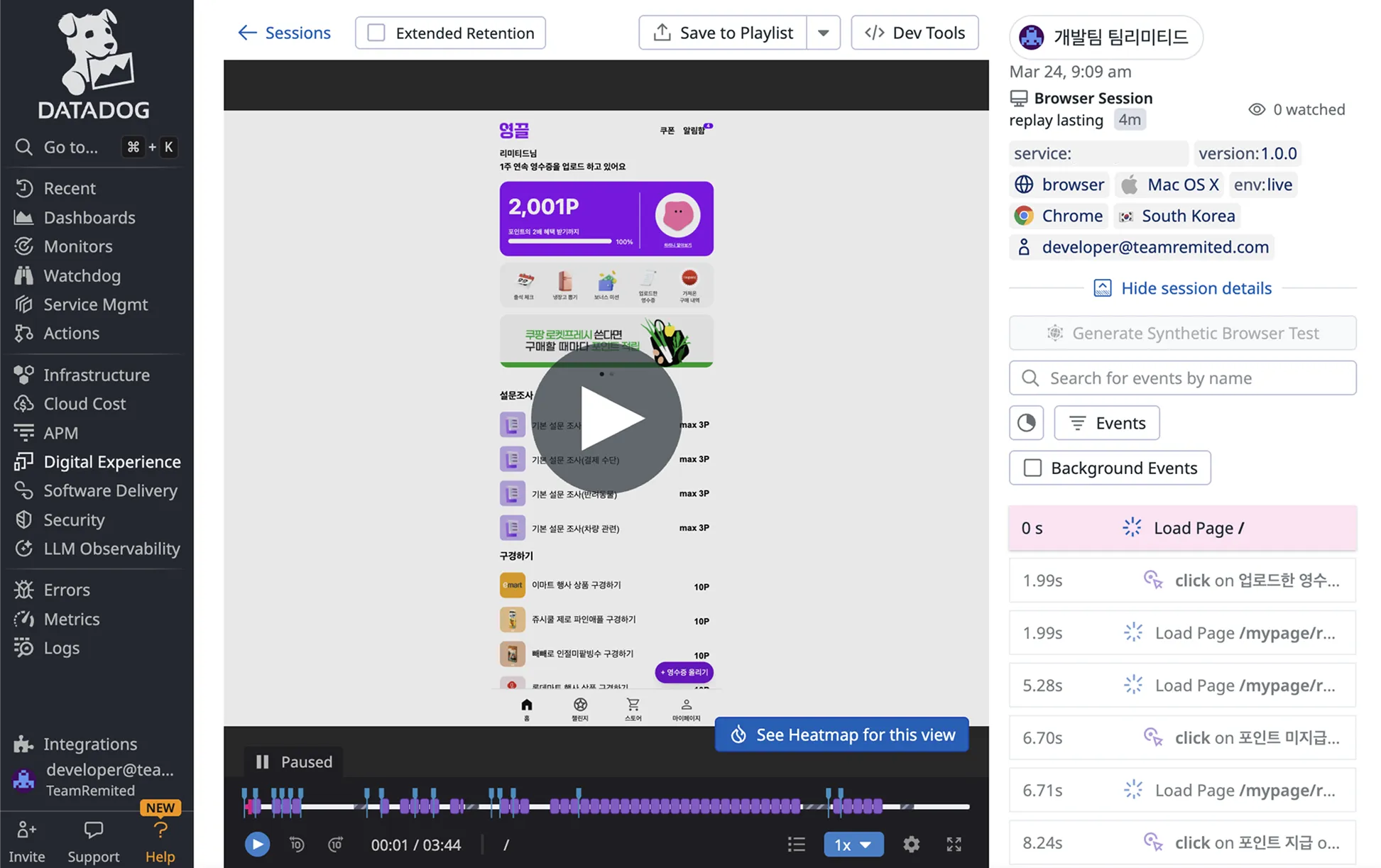 Real User Monitoring(RUM) 기능이요. 유저가 실제로 어떤 화면에서 어떤 액션을 했는지를 확인할 수 있어서 CS 대응과 프로덕트 개선에 큰 도움이 되고 있어요. 그리고 슬랙 노티피케이션 기능도 활용 중인데 에러나 이상 행동 발생 시 즉시 알림을 받을 수 있어 관련 문제에 팀 전체가 빠르게 대응하는데 많은 도움을 받고 있습니다.